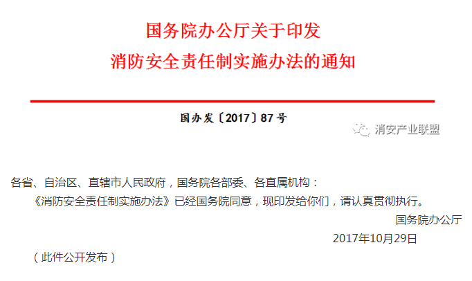 國(guó)務(wù)院辦公廳《關(guān)于印發(fā)消防安全責(zé)任實(shí)施辦法的通知》
