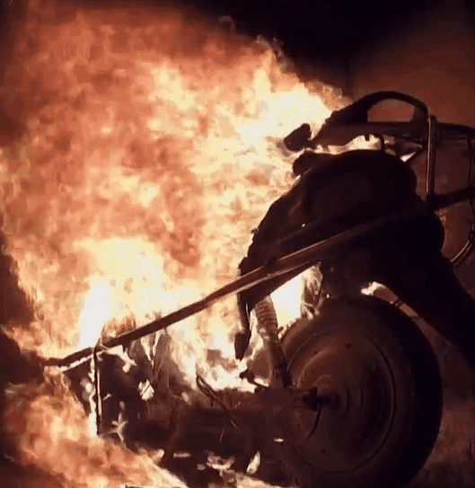 不到10分鐘時(shí)間,電動(dòng)車尾部開(kāi)始冒出黑煙,冒煙40秒后火勢(shì)迅速擴(kuò)大,1分鐘內(nèi)黑煙越來(lái)越多,并伴有火焰滴落。