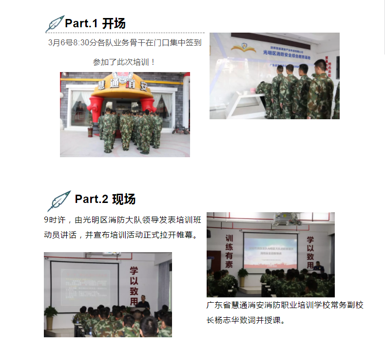 時(shí)間:2019-03-19 11:35:20在深圳努力率先高質(zhì)量全面建成小康社會(huì)的關(guān)鍵之年,為構(gòu)建平安光明、和諧光明、幸福光明,堅(jiān)決維護(hù)我區(qū)人民群眾生命財(cái)產(chǎn)安全,矢志不斷學(xué)習(xí)、練就過(guò)硬本領(lǐng),不懈提升光明區(qū)消防大隊(duì)消防救援人員消防安全巡查業(yè)務(wù)能力,及時(shí)掌握改革轉(zhuǎn)隸后的職能轉(zhuǎn)變,不斷適應(yīng)新形勢(shì)下對(duì)消防救援員提出的新要求,深圳市消防支隊(duì)光明區(qū)大隊(duì)消防救援員防消聯(lián)巡集訓(xùn)于2019年3月6日至13日在慧通消安消防安全綜合教育基地圓滿舉辦,光明區(qū)消防大隊(duì)下轄各中隊(duì)、分隊(duì)業(yè)務(wù)骨干參加了此次培訓(xùn),本次活動(dòng)由廣東省慧通消安消防職業(yè)培訓(xùn)學(xué)校承辦。