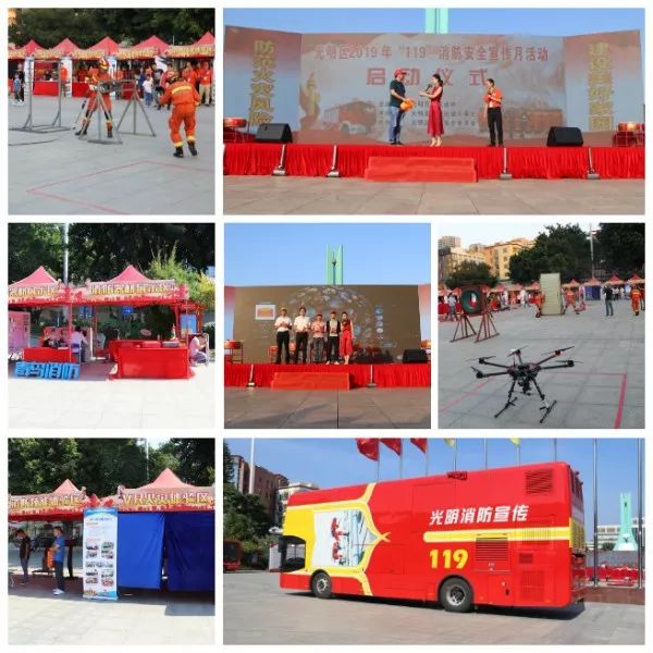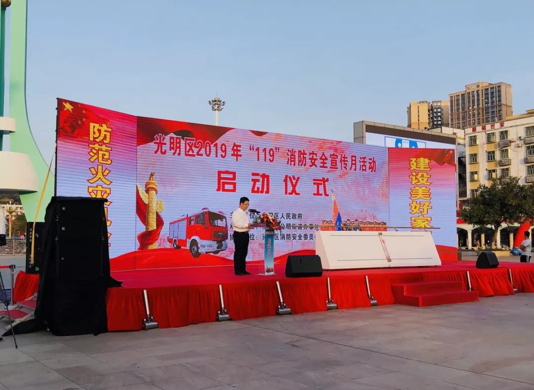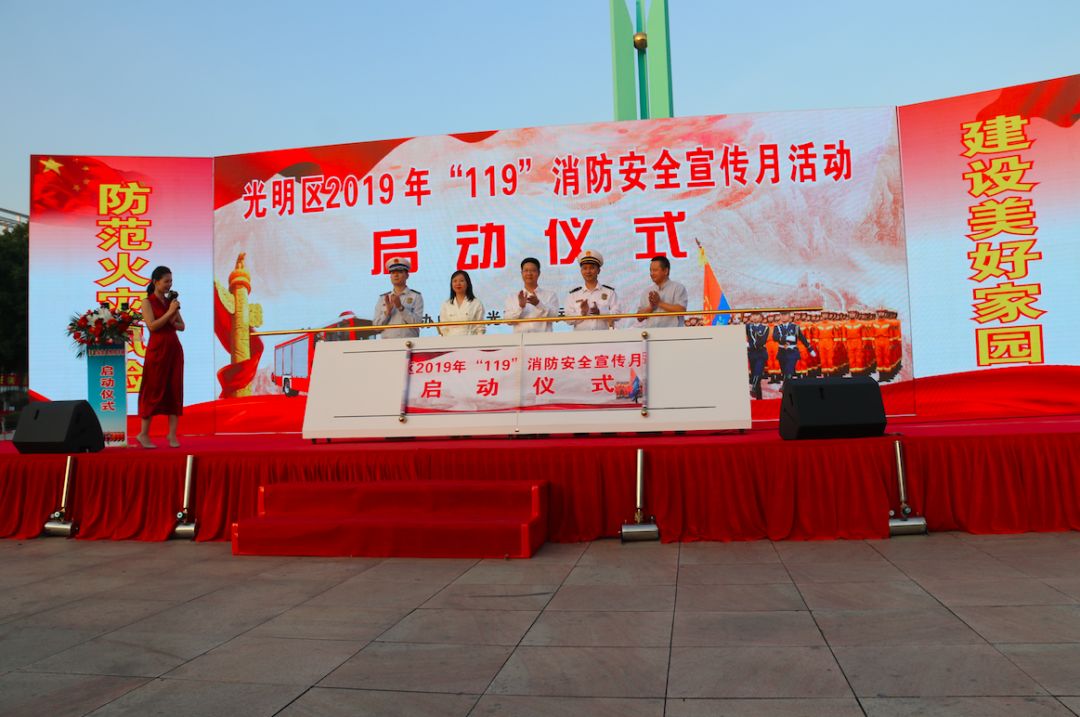 2019年11月7日下午,以“防范火災(zāi)風(fēng)險,建設(shè)美好家園”為主題的光明區(qū)2019年“119”消防安全宣傳月活動啟動儀式在光明區(qū)公明廣場圓滿舉行。光明區(qū)常務(wù)副區(qū)長劉德峰,區(qū)消防大隊大隊長朱新文、副大隊長張志,公明街道辦事處主任黃曉瑜,區(qū)應(yīng)急局調(diào)研員左信寬。區(qū)委宣傳部、區(qū)委政法委、區(qū)各職能部門、各街道及社區(qū)負責(zé)人出席啟動儀式。全區(qū)各行各業(yè)代表、消防志愿者、群眾、消防大隊指戰(zhàn)員以及媒體記者1476人參加現(xiàn)場活動,4000余人參與線上互動。