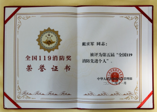 第五屆全國119消防先進集體和先進個人經(jīng)過逐級嚴格的推薦和評選,廣東省6個集體、7名個人成功入選,戴求軍先生是廣東省唯一獲此殊榮的民營企業(yè)家。