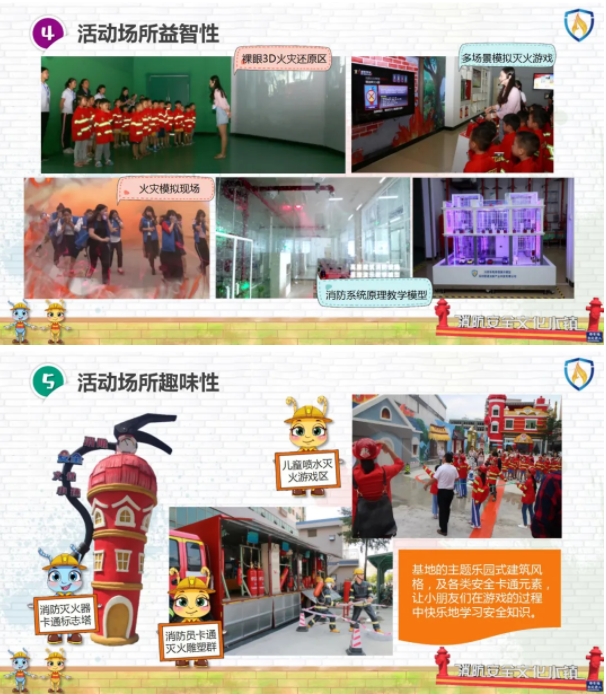 基地共分為23個功能區(qū),以全方位向民眾普及消防科普教育為己任,融合各類卡通消防安全元素,以消防安全“四個能力”建設(shè)為主線,集理論、實操、體驗、教育、文化和智慧消防于一體,打造“寓教于樂”的消防安全新文化IP,成為一家獨具特色的新型示范消防安全綜合教育基地。